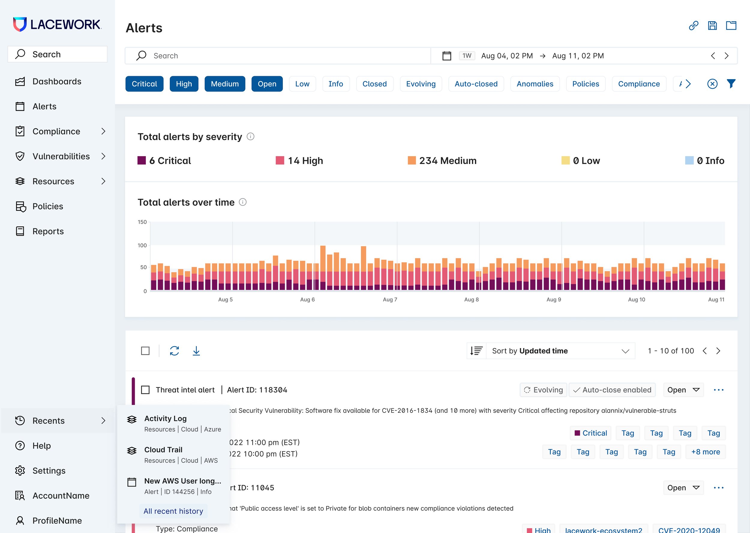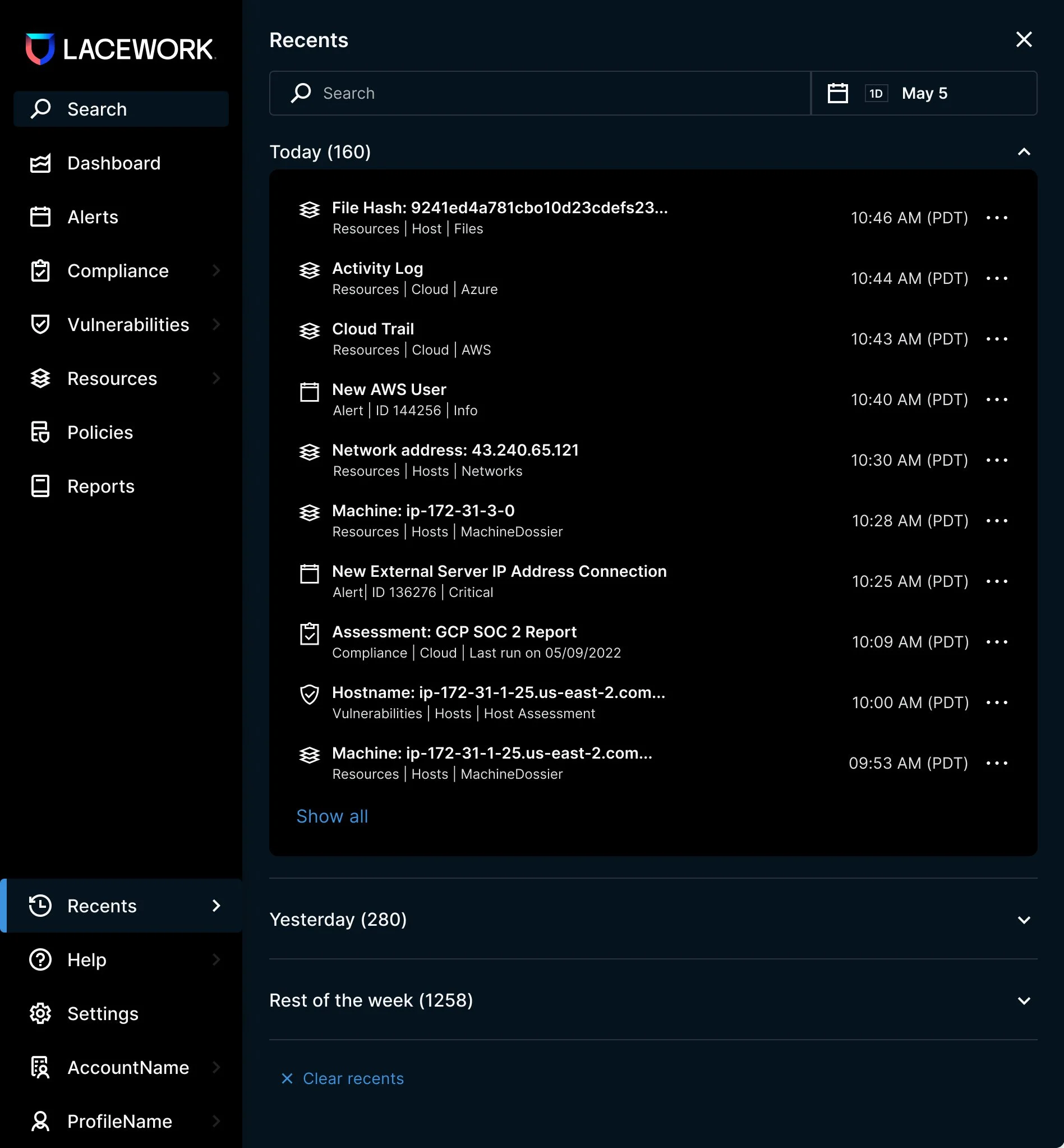 The Recents feature is a tab within the UI on Lacework's platform. The purpose of Recents is to allow customers to quickly find and retrieve recently visited entities and pages on the platform. After the initial release of the product that focused on Events and Resources, the product offering expanded, and additional features and tabs were added to the platform. Recent, on the other hand, has not been revisited and does not capture entities outside of Events and Resources.